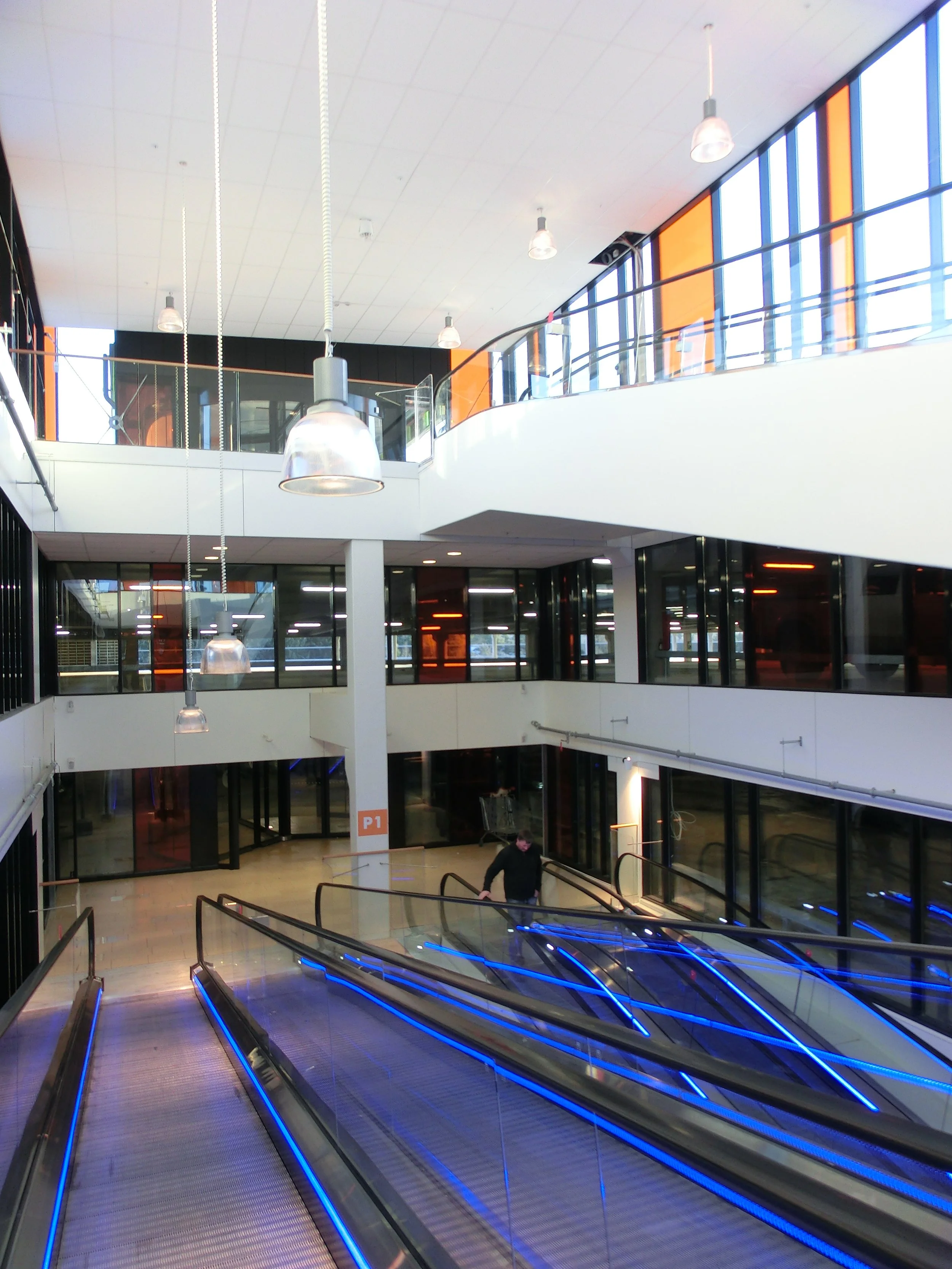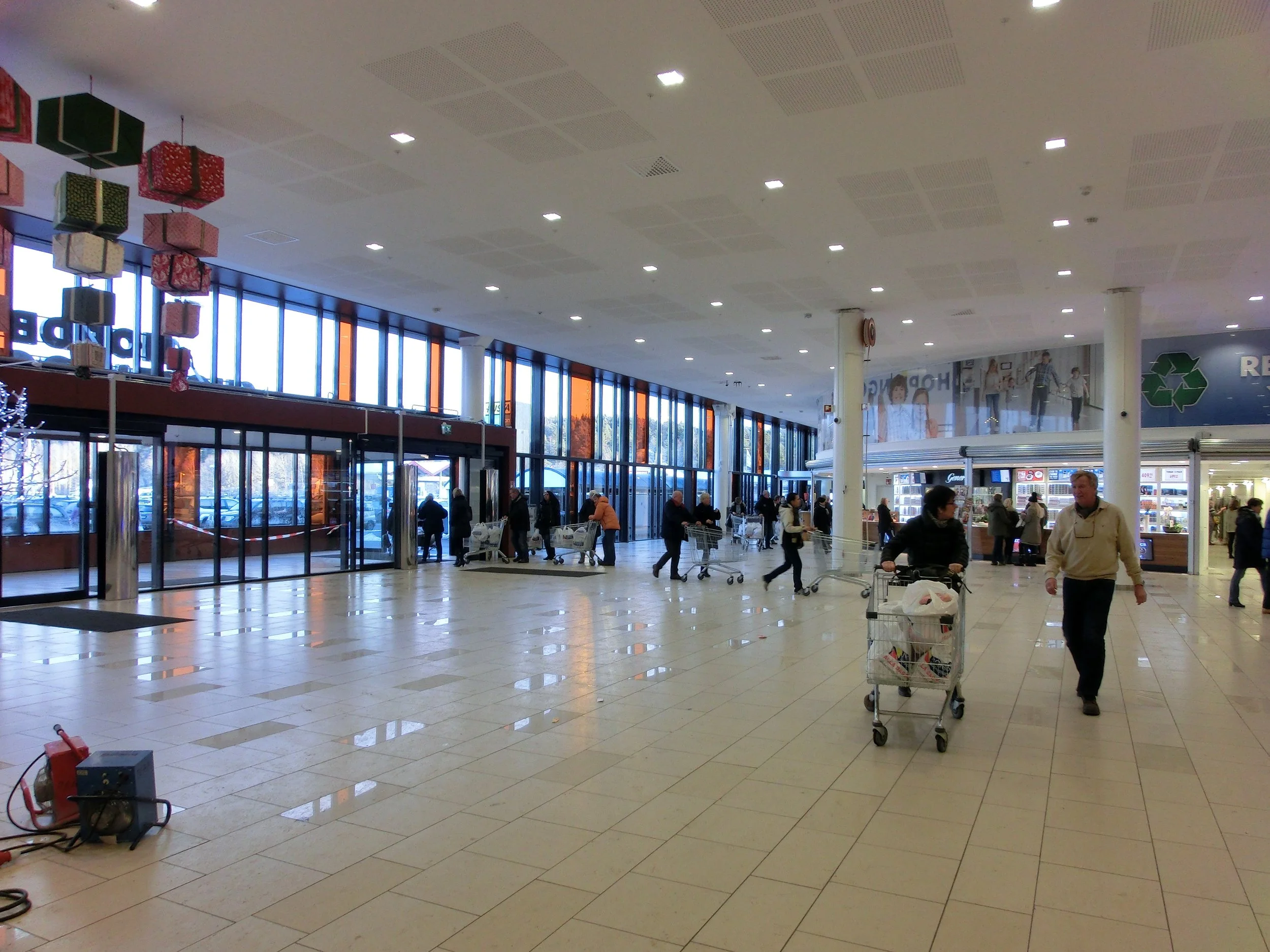 Vår arkitektur är nyskapande och präglas av en modern design. Den kommunikativa delen mellan våningarna är prydd med färgglada glas, vilket inte bara ger en lekfull touch utan också skapar en ljus och luftig atmosfär inuti centret. Dessa glaselement bidrar till en öppen och välkomnande känsla, vilket gör ditt shoppingäventyr till en trevlig upplevelse.